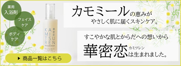 薬用入浴剤はじめとする華密恋スキンケアシリーズはすべて天然・植物由来の成分を使用。独自製法のカミツレエキスをすべての製品に配合し、合成の香料・着色料・保存料・鉱物油などは一切使用しておりませんので、赤ちゃんからご年配の方まで、年齢や性別を問わずあらゆる方々に安心してお使いいただけます。