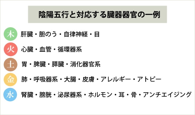 自然界・人間の身体・感情・季節・臓腑器官など、あらゆるものをこの五つに分類し、それぞれが相生(そうせい)=助け合う関係と、相克(そうこく)=制御し合う関係を持つことで、調和を保っていると考えます。