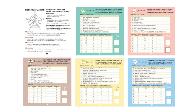 本商品には、東洋医学の陰陽五行理論(木・火・土・金・水)に基づいた体質チェックシートが付属しています。このシートを使うことで、ご自身の現在の「偏り」や「乱れ」、「不足傾向」を簡単にセルフチェック可能です。