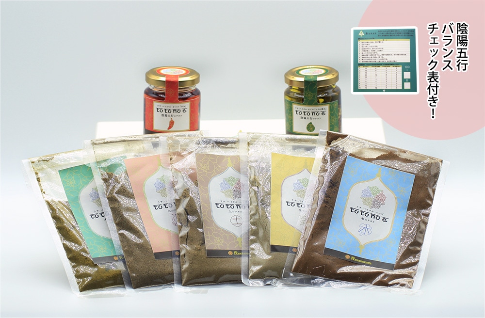 陰陽五行(木・火・土・金・水)のエネルギーバランスに着目し、山梨先生の波動測定をもとに、五行それぞれに対応するスパイスを独自に調合しました。